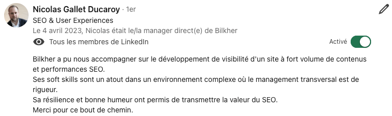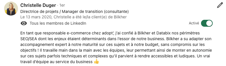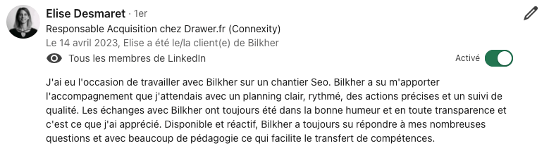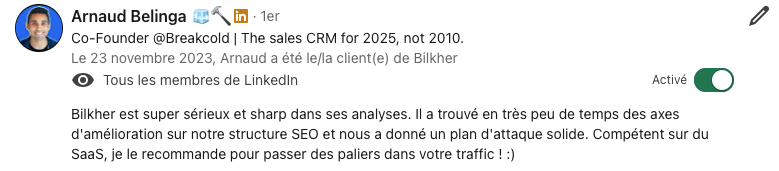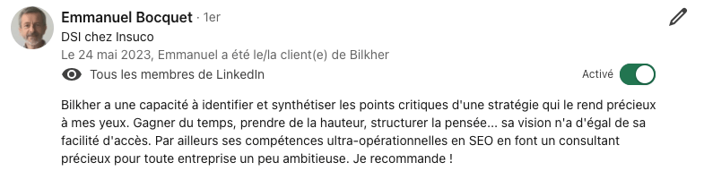 En 12 ans d'expérience, j'ai accompagné +250 entreprises dans leur croissance organique et d'augmenter significativement leur chiffre d'affaire grâce aux canaux organique.